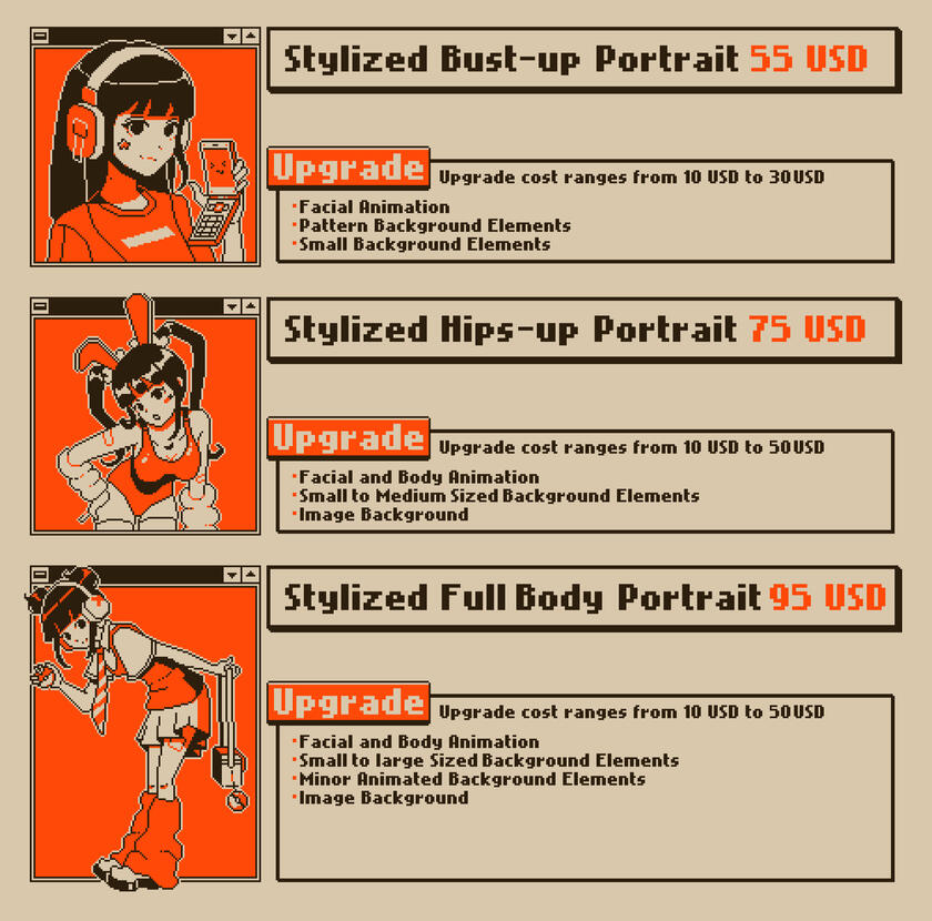 Rates may vary depending on canvas size and amount of detail. Send a direct message or an email to get a quotation!